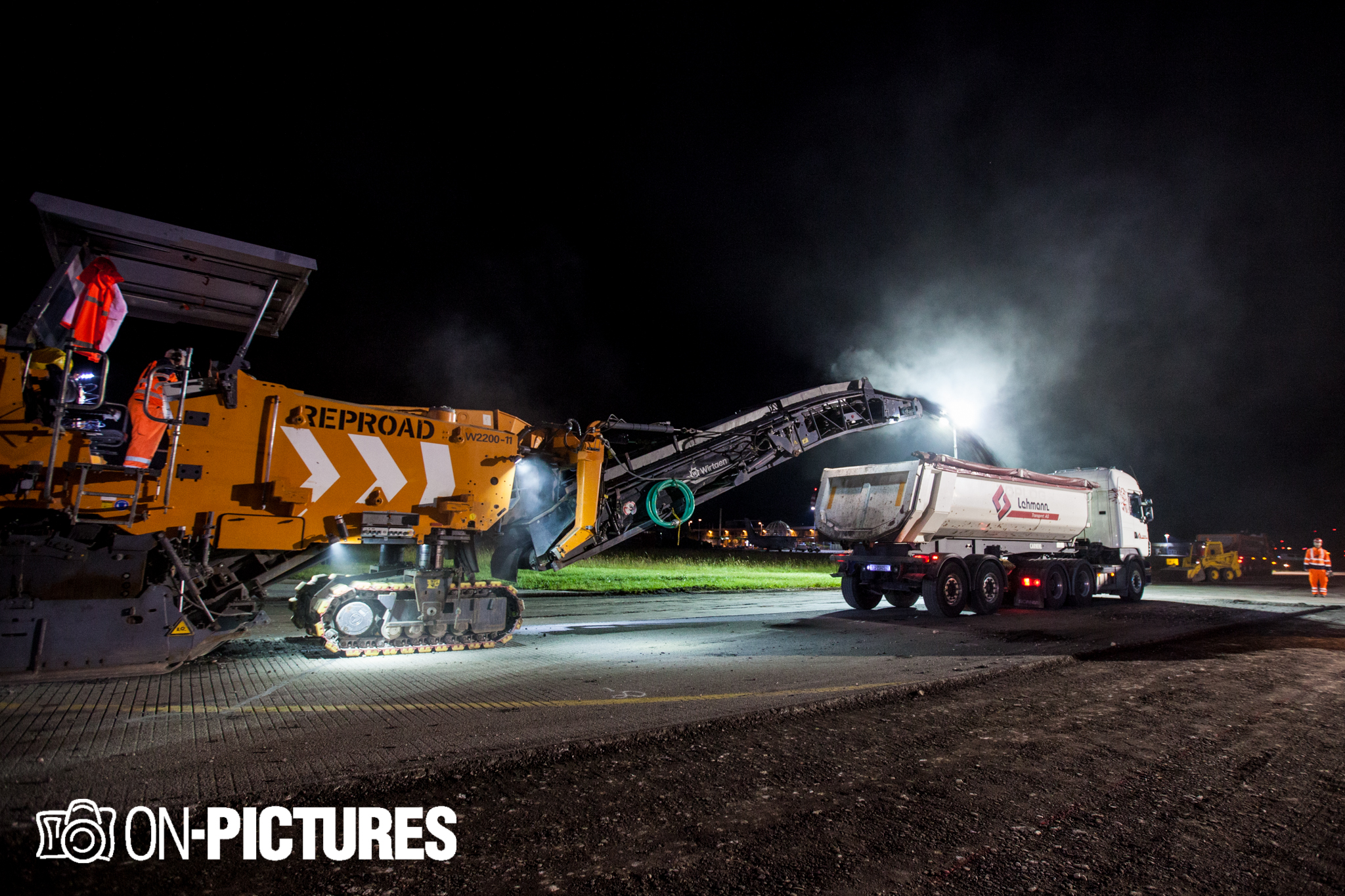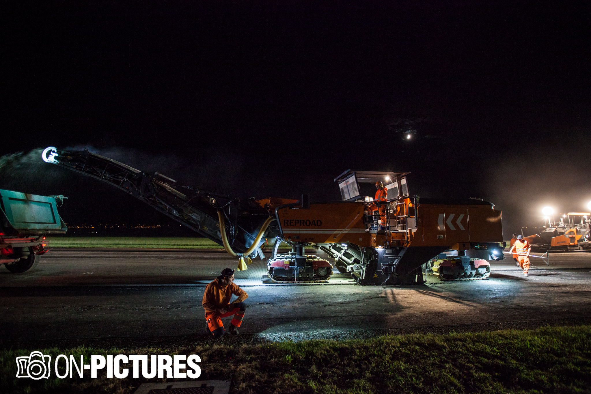 Nachts zwischen 23.00 und 06.00 Uhr (ausgenommen Samstag- und Sonntagnacht) werden 8cm der bestehenden Betonpiste durch eine neue Asphaltschicht ersetzt. Wir konnten anlässlich der Baustellenbesichtigung die Arbeiten fotografisch dokumentieren.